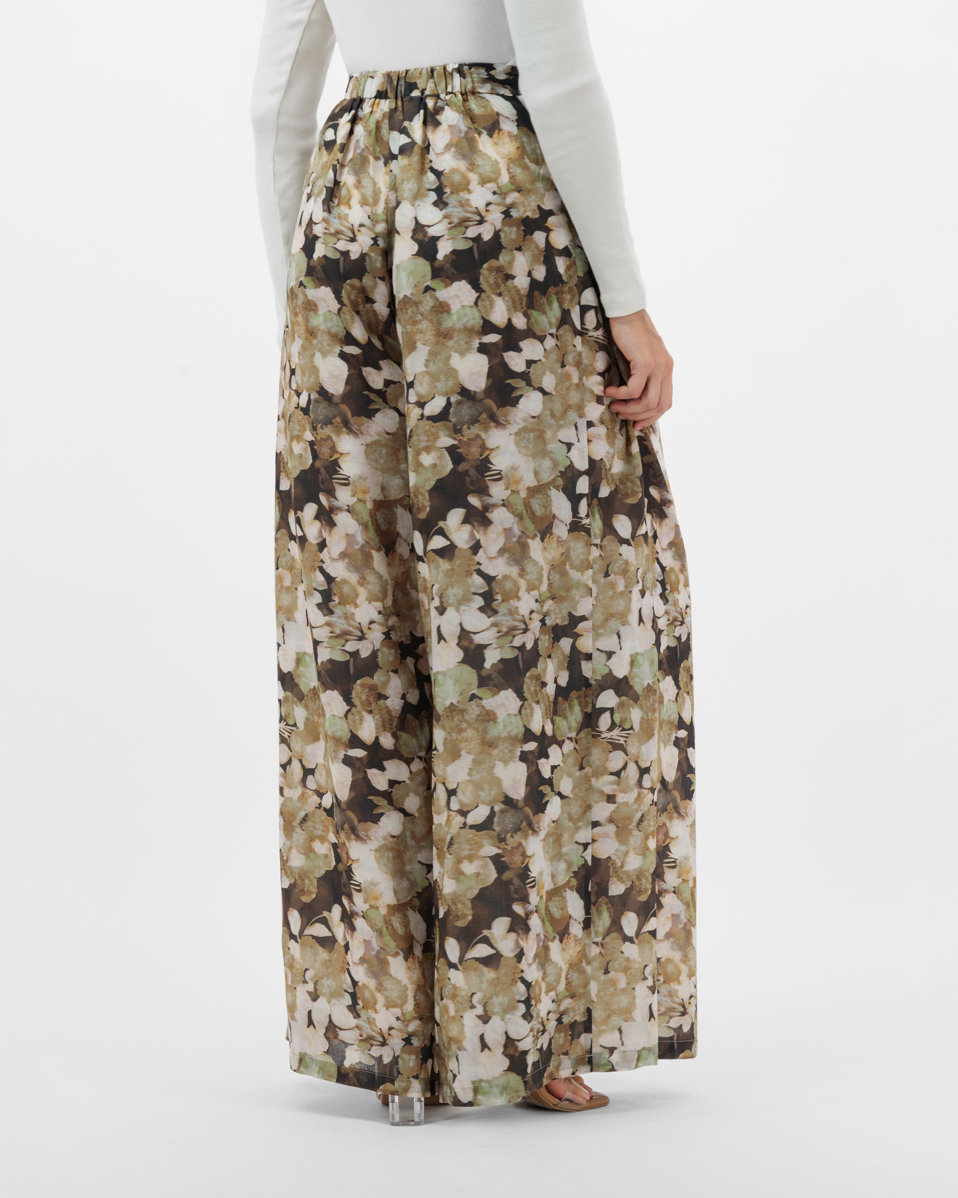 Crafted from a lightweight, fluid fabric, the trousers move beautifully with every step. The large-scale floral print in earthy neutrals—beige, taupe, olive, and brown—adds a soft, understated charm with a muted, low-contrast finish. Discreet side pockets maintain a clean, polished front.