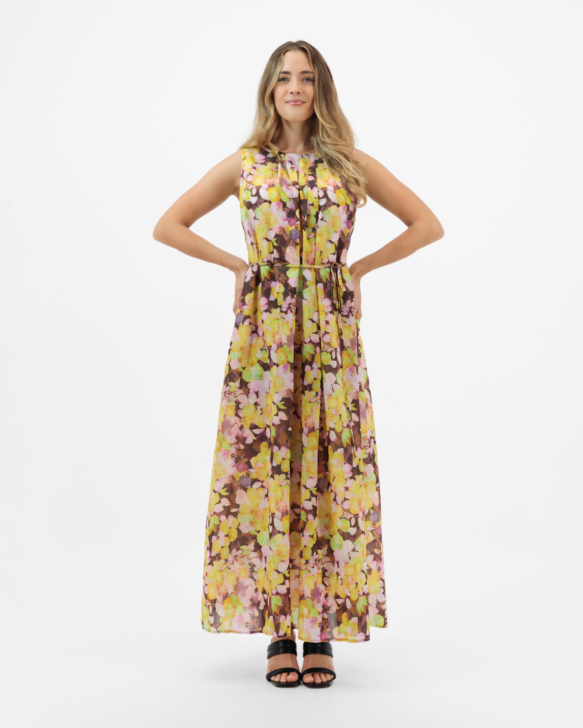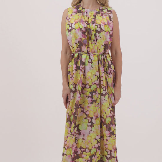 This elegant sleeveless dress features a softly gathered crew neckline and a cinched waist accentuated by a slim, delicate belt. Crafted from a lightweight fabric with an airy, fluid drape, it showcases a beautiful watercolor-style floral print in sunny yellows, blush pinks, soft lilacs, gentle greens, and warm earthy browns for added depth.